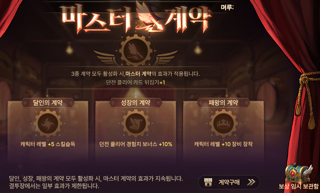 | 마스터 계약 - 던전 클리어 카드 뒤집기+1 | 1회 클리어시 약 10,000골드 |